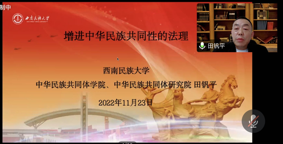 为深入学习二十大精神,增进铸牢中华民族共同体意识的理论认知和学理阐释,2022年11月23日,民族法党支部组织“二十大精神”系列讲座之《增进中华民族共同性的法理探析》。本次讲座特邀西南民族大学中华民族共同体学院副院长田钒平教授主讲,韩国三级片 副院长、民族宗教研究院院长宋海彬教授主持,民族法党支部全体教师及校内外广大师生一百余人参加。