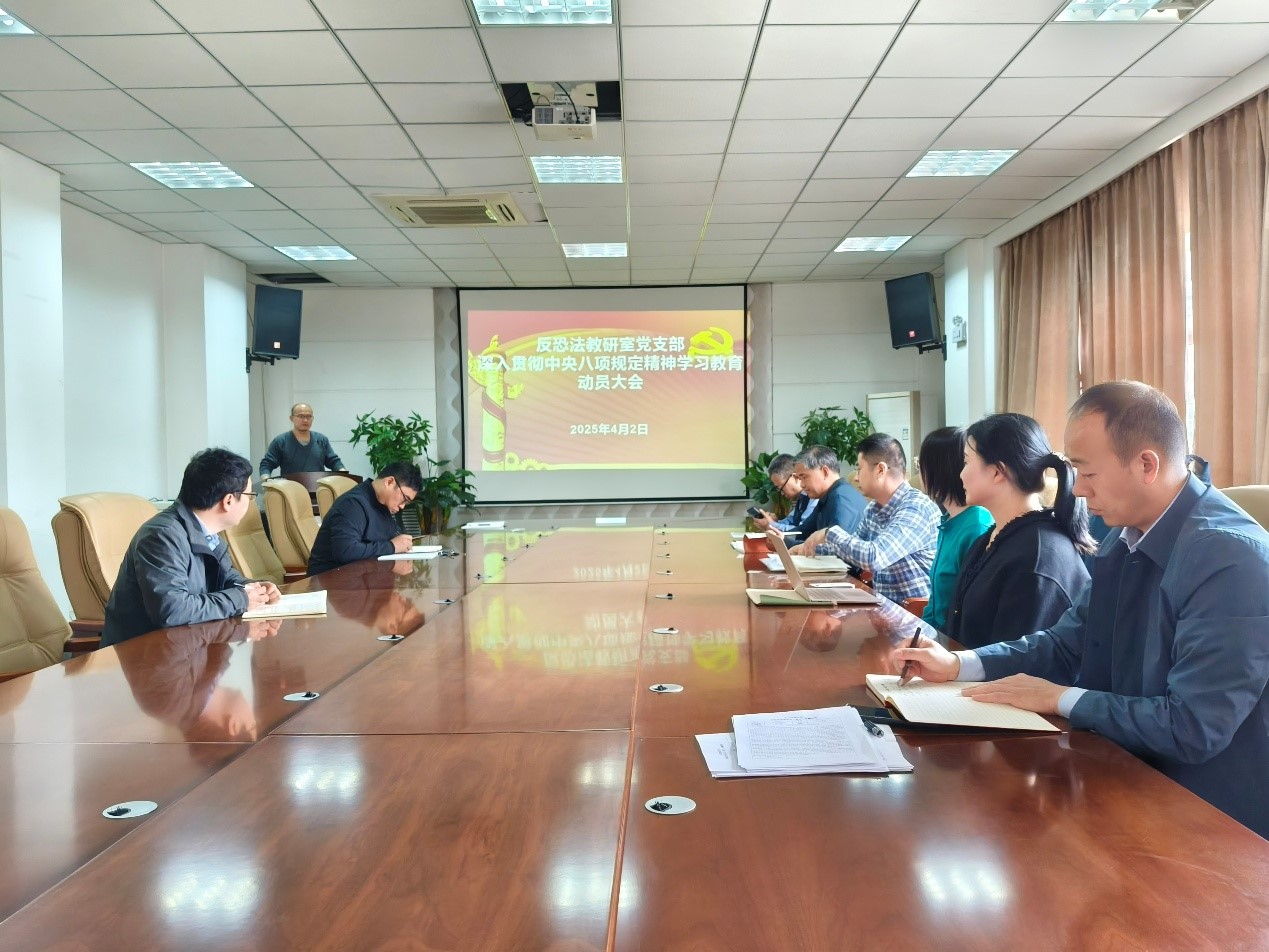 2025年4月2日中午,反恐怖主义法教研室党支部在学院会议室组织召开深入贯彻中央八项规定精神学习教育动员大会。会议由党支部书记张波主持,党支部党员同志参加会议。