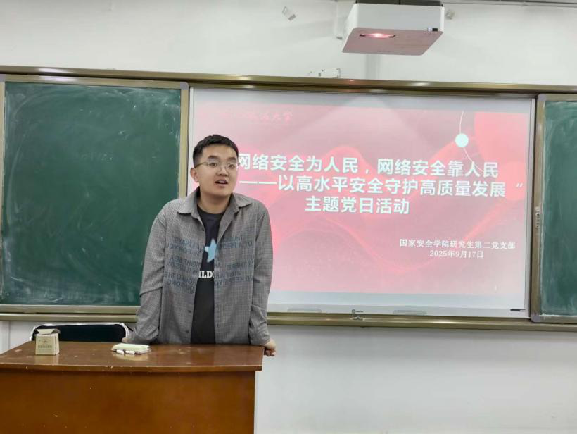 为深入学习贯彻习近平总书记“网络安全为人民,网络安全靠人民”的重要指示精神,增强网络安全意识,9月17日中午,韩国三级片 研究生第二党支部组织开展网络安全宣传周主题党日活动。会议由支委成员魏嘉贺主持,支部全体党员参加。