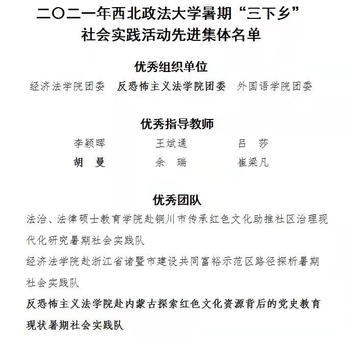 校团委经过认真考查,决定授予反恐怖主义法学院团委“优秀组织单位”称号;授予反恐怖主义法学院胡曼老师“优秀指导教师”称号;授予反恐怖主义法学院赴内蒙古探索红色文化资源背后的党史教育现状暑期社会实践团队“优秀团队”称号;授予尹瑞涛等6名同学“社会实践活动先进个人”称号;授予闫晓雯等3名同学的暑期社会实践征文为“社会实践活动优秀论文”。