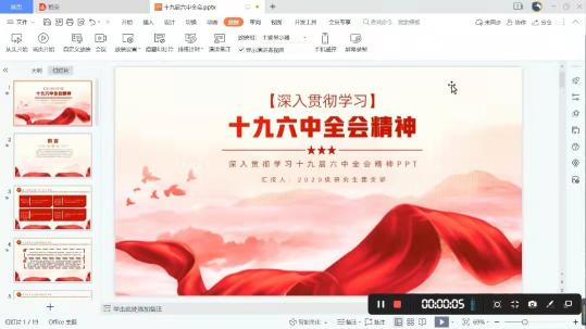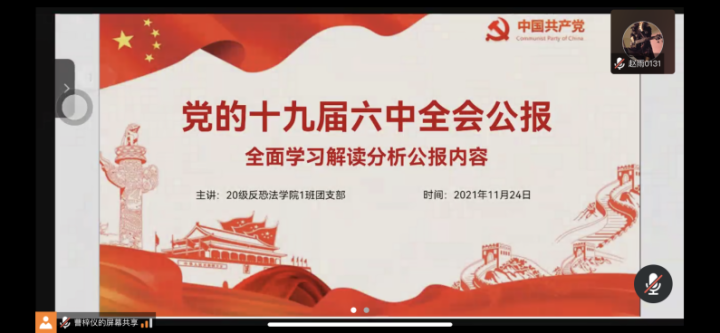 11月25日,2020级研究生团支部开展了以“深入贯彻学习党的十九届六中全会精神”为主题的主题团课,以主持人讲解、PPT展示、视频欣赏、同学讨论发言与交流互动等丰富形式带领同学们领悟党的十九届六中全会精神的实质,号召新时代的中国青年大学生坚定地团结在党的周围继续奋斗,弘扬伟大建党精神,为实现第二个百年奋斗目标、实现中华民族伟大复兴的中国梦而不懈奋斗。