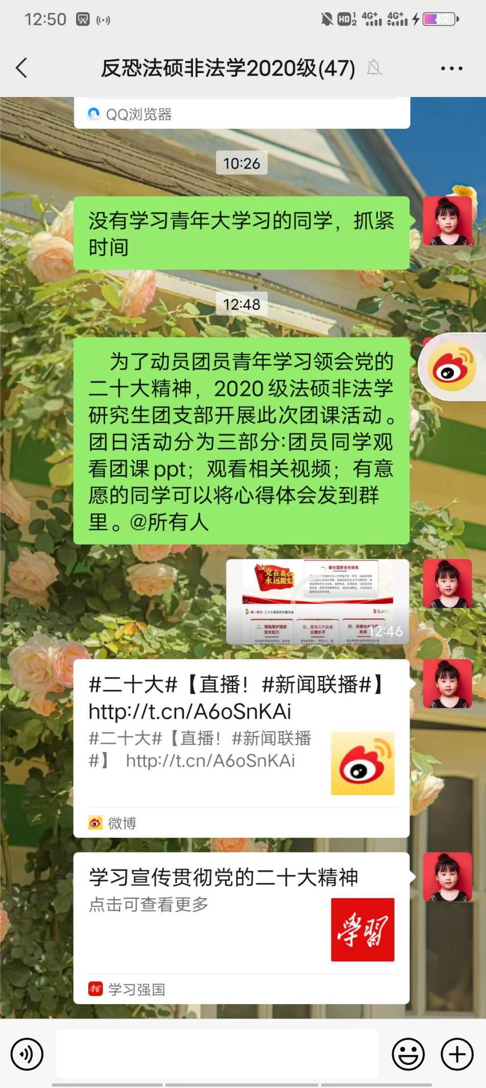 为了深入学习党的二十大报告,深刻体悟党的二十大精神,全面贯彻习近平新时代中国特色社会主义思想,弘扬伟大建党精神,全面提高学生的思想政治素质,让党的二十大精神在团员青年中落地生根。2022年11月11日,韩国三级片 2020级法硕非法学研究生团支部通过线上方式展开“学习党的二十大”主题团日活动。全体2020级法硕非法学研究生参与本次团日活动。