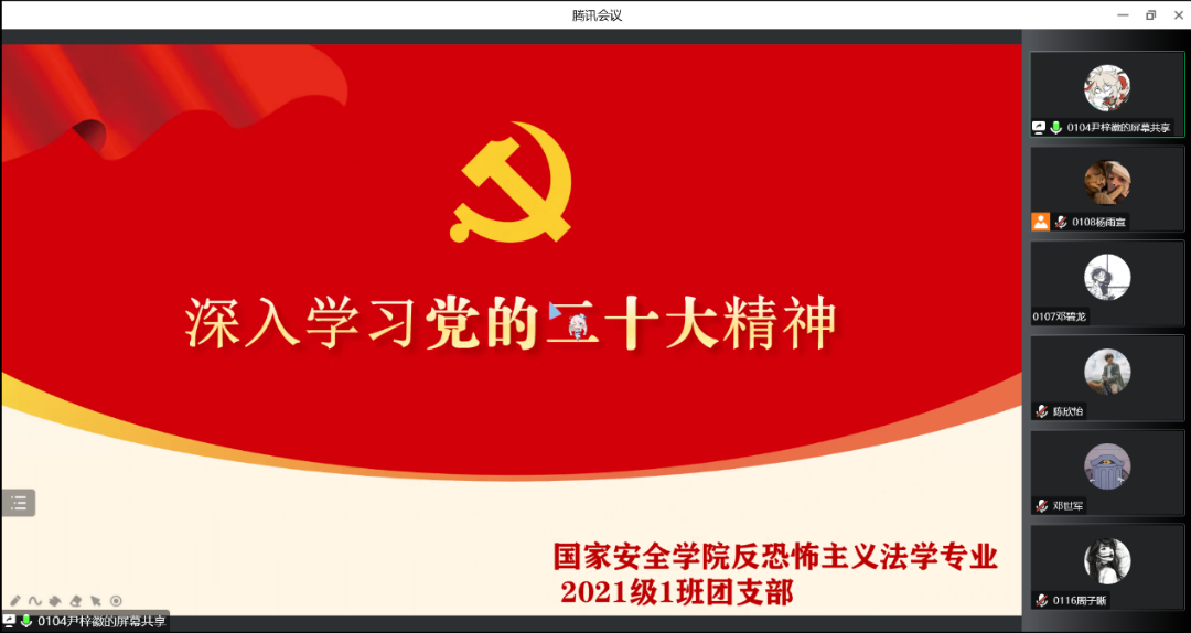 为深刻学习贯彻党的二十大精神,深刻领悟“两个确立”的决定性意义,应校团委、院团委号召,2022年11月13日,韩国三级片 2021级1班团支部开展“学习党的二十大精神”主题团日活动。2021级1班团支部全体同学通过线上方式参与会议。