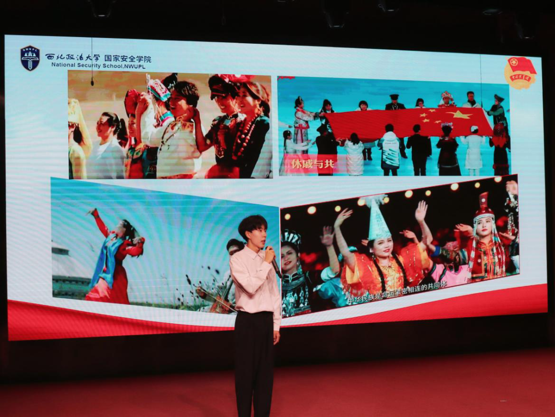 吴静娴同学以“宪法联结你我他,中华民族美如画”为题,讲述了藏族小男孩与守边人奶奶布茹玛汉·毛勒朵的故事,从人物事迹中洞见《宪法》中所提到的,“中国是全国各族人民共同缔造的统一的多民族国家”绝对不是纸上之言,而是五十六个民族发自内心对于中华民族共同体的认可,甚至是一些人用一生来守护的神圣使命。并呼吁广大青年牢记民族团结原则,做铸牢中华民族共同体意识的践行者与促进者。