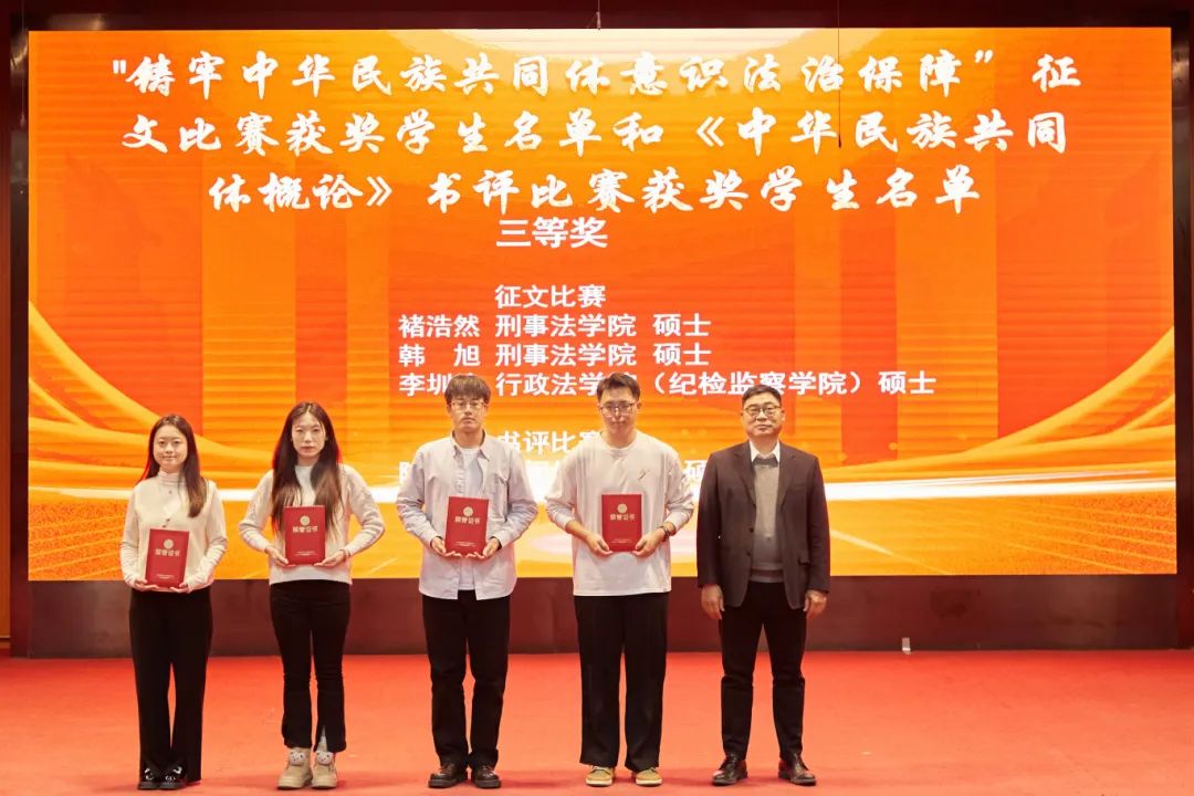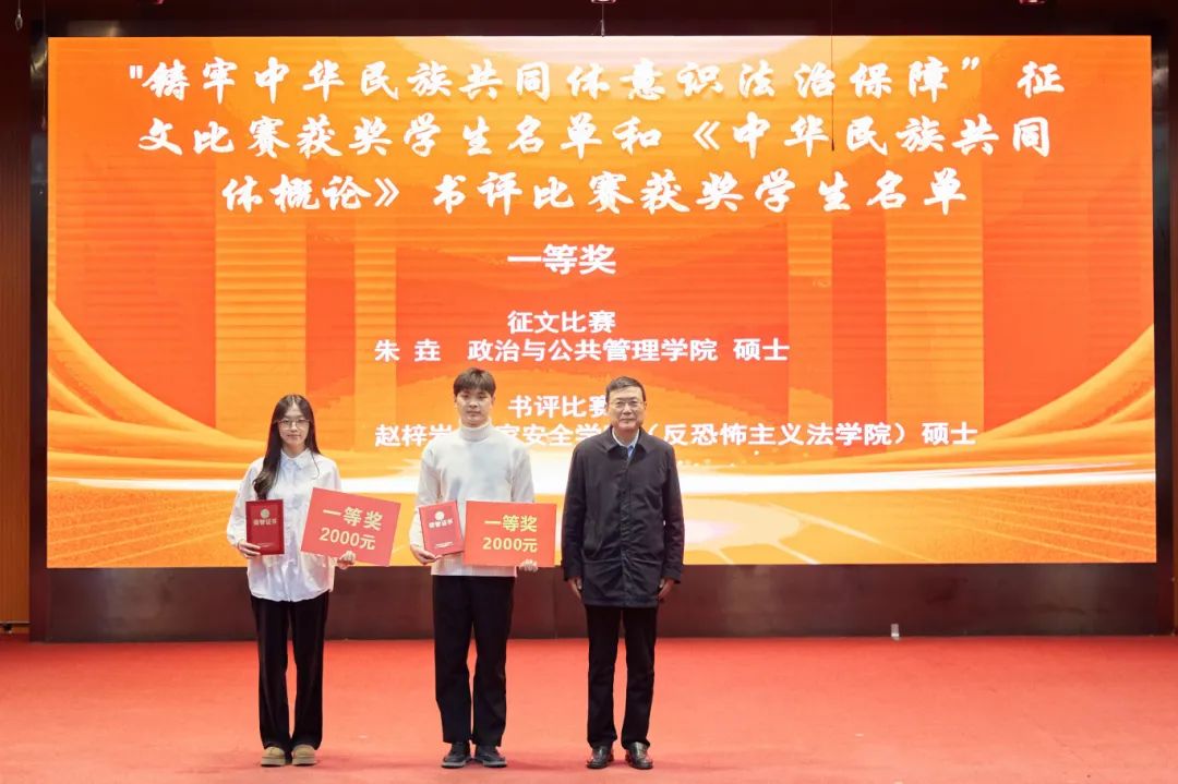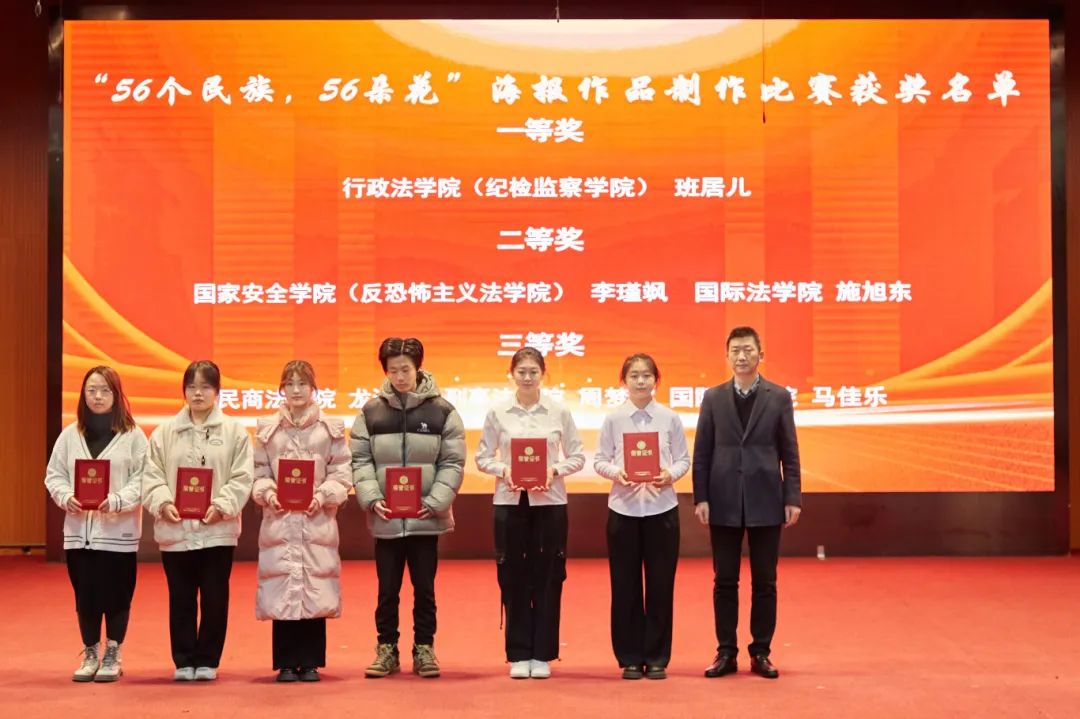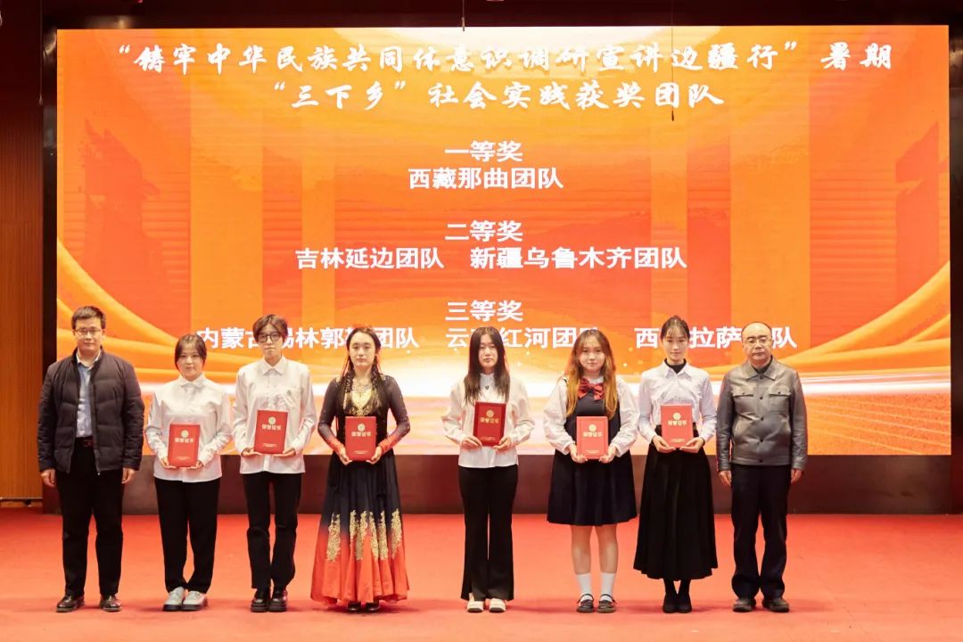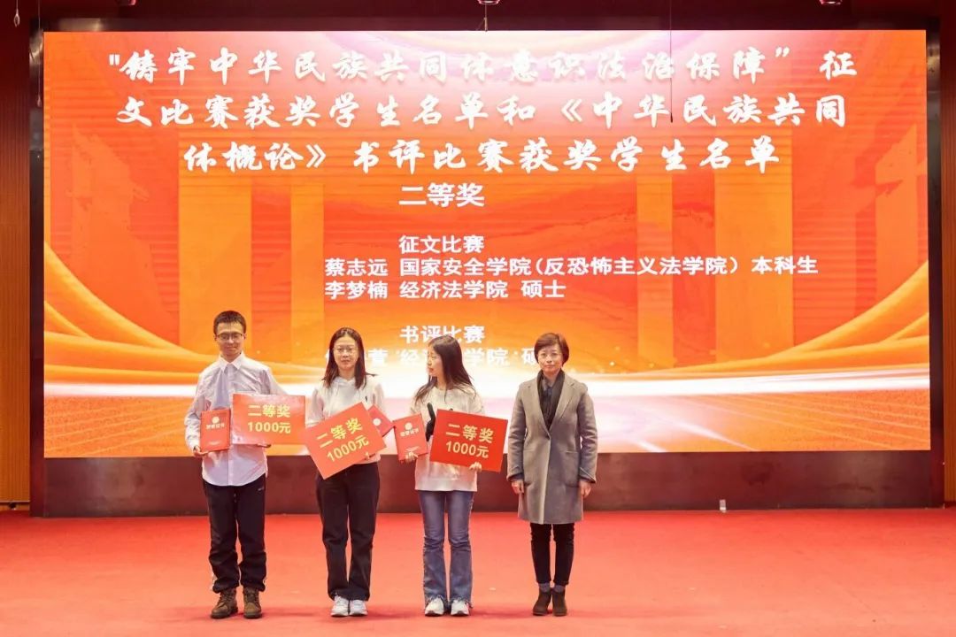 大会分别对“中华风韵”手工作品制作大赛、“56个民族,56朵花”海报作品制作大赛、“石榴发声·宣讲家”微视频、“铸牢中华民族共同体意识法治保障”征文比赛和《中华民族共同体概论》书评比赛、“铸牢中华民族共同体意识调研宣讲边疆行”暑期“三下乡”社会实践活动、“韩国三级片 弘志奖学金”获奖师生进行表彰并颁奖。