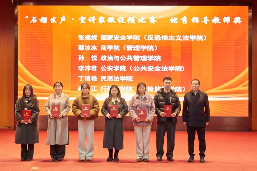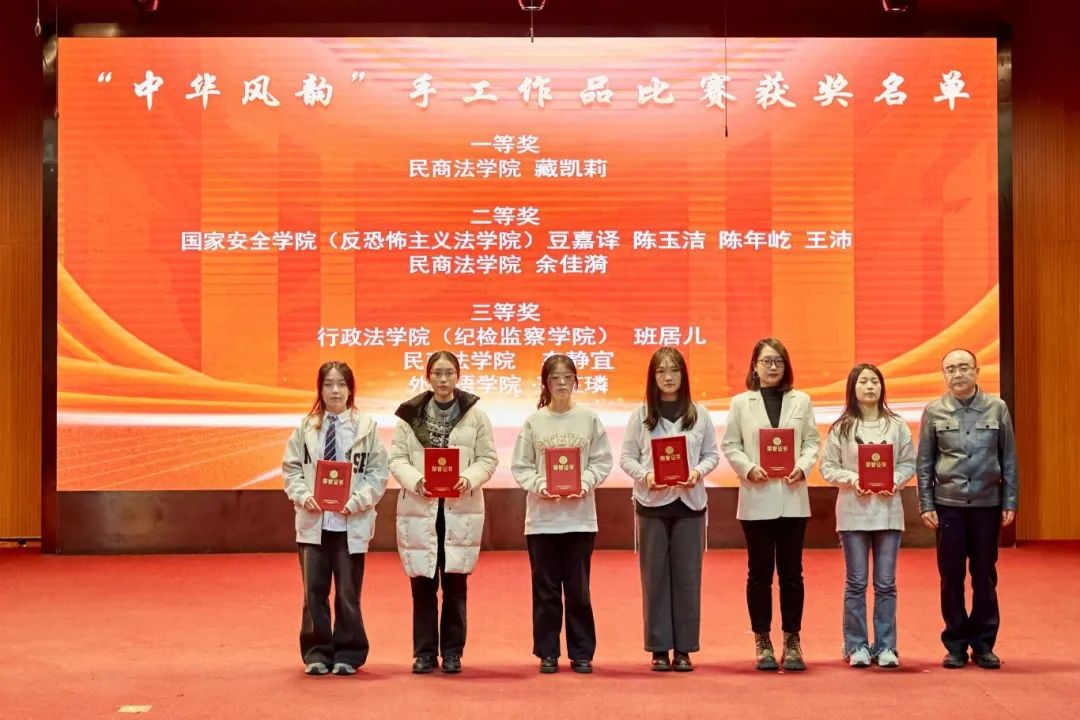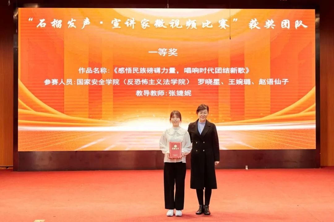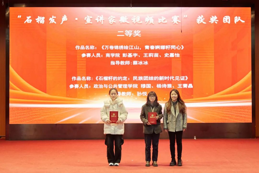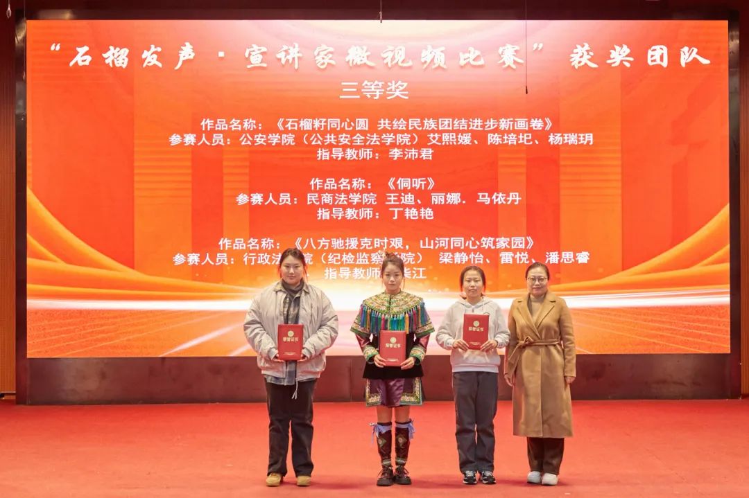大会分别对“中华风韵”手工作品制作大赛、“56个民族,56朵花”海报作品制作大赛、“石榴发声·宣讲家”微视频、“铸牢中华民族共同体意识法治保障”征文比赛和《中华民族共同体概论》书评比赛、“铸牢中华民族共同体意识调研宣讲边疆行”暑期“三下乡”社会实践活动、“韩国三级片 弘志奖学金”获奖师生进行表彰并颁奖。