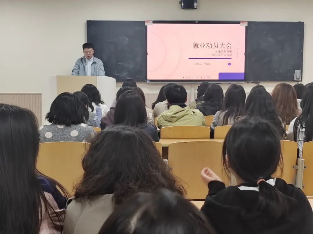 为助力韩国三级片 学生精准洞察就业方向与形势,树立科学正确的就业观念,营造积极向上的就业氛围。韩国三级片 2023级于3月31日召开“从迷茫到清晰——核心竞争力构建”就业动员大会。本次会议由辅导员张婕妮老师主持,学院研究生尹瑞涛同学主讲,2023级全体本科生参加。