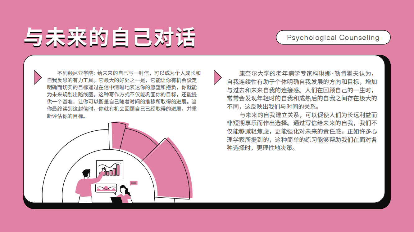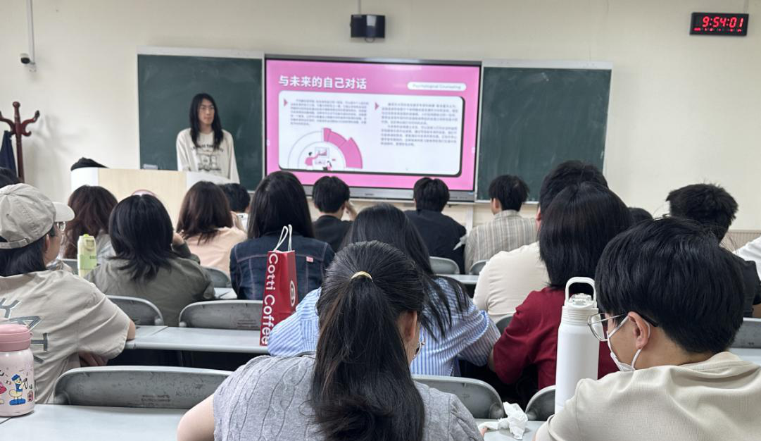 会上,师文同学系统讲解了“叙事疗法”与“自我同一性理论”,阐明书写对心理调适的作用:“将抽象焦虑转化为具体文字,能有效降低情绪压力。”随后播放《致十年后的我》心理微课视频,结合埃里克森人格发展理论,解析青年期目标建构的重要性。