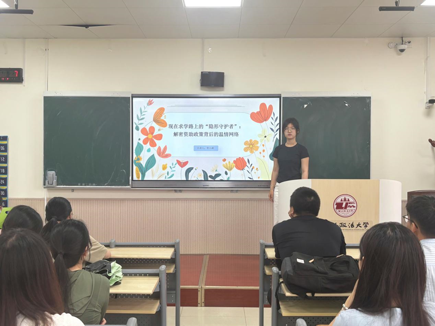会上,贺小漪同学分别从“资助政策知多少”“资助政策意义”“资助政策的体系”和“真实案例”四个方面进行了讲解,点明资助政策为家庭经济困难学子保驾护航的重要意义;详细剖析国家奖学金、国家助学金、学校和学院的奖学金与助学金等政策,解读申请条件与评定标准,让同学们明晰每一份资助背后的激励与关怀;同时,对生源地信用助学贷款、勤工助学岗位的申请流程及注意事项进行细致说明,为同学们提供全方位的指引。此外,还通过真实的资助故事案例,展现政策如何改变学子命运,传递资助政策的温度与力量。