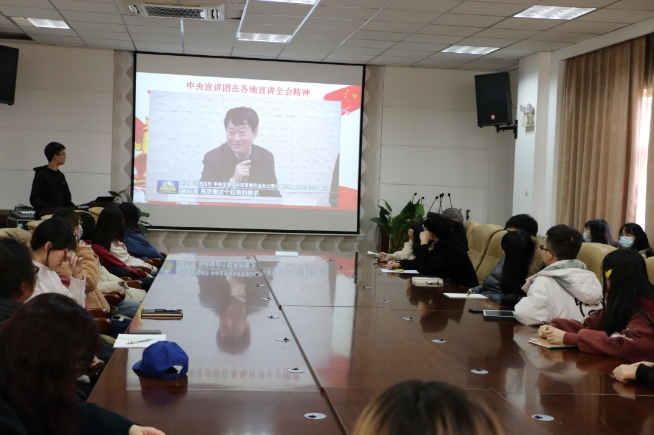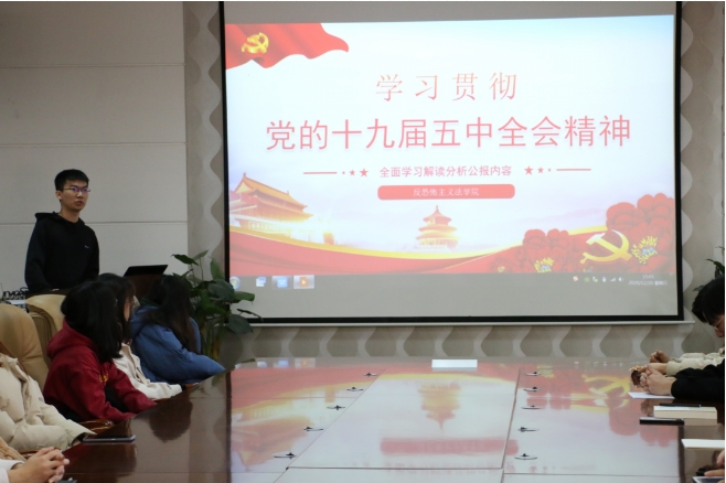 为学习贯彻党的十九届五中全会精神,巩固团支部“不忘初心,砥砺奋进”主题教育成果,引导团员干部强化政治思想引领,厚植爱党爱国情怀,推动全会精神在我校落地生根,取得成效,12月20日下午,反恐怖主义法学院团委组织各年级团干部在学院会议室举行“学习贯彻党的十九届五中全会精神”主题宣讲活动。