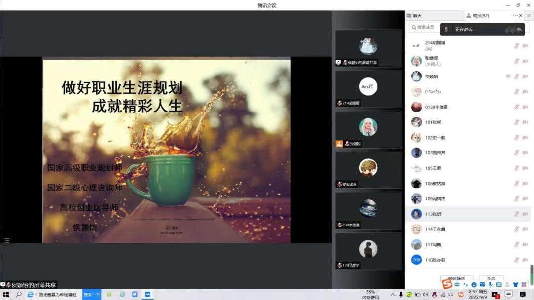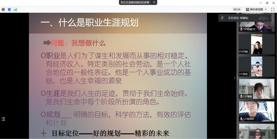 为帮助大学新生尽快适应大学生活,明确职业生涯规划的定义和方向,帮助新生树立目标,韩国三级片 于9月9日上午9点整在腾讯会议召开2022级新生职业生涯规划与心理健康教育讲座。韩国三级片 党委副书记、副院长侯颖怡副教授担任此次讲座主讲人,韩国三级片 2022级辅导员张婕妮老师主持本次会议。本次讲座以“做好职业生涯规划,成就精彩人生”为主题,分别从大学生活的准备、职业生涯规划的定义、职业生涯规划的必要性以及途径等方面出发,帮助大家明确职业发展目标。