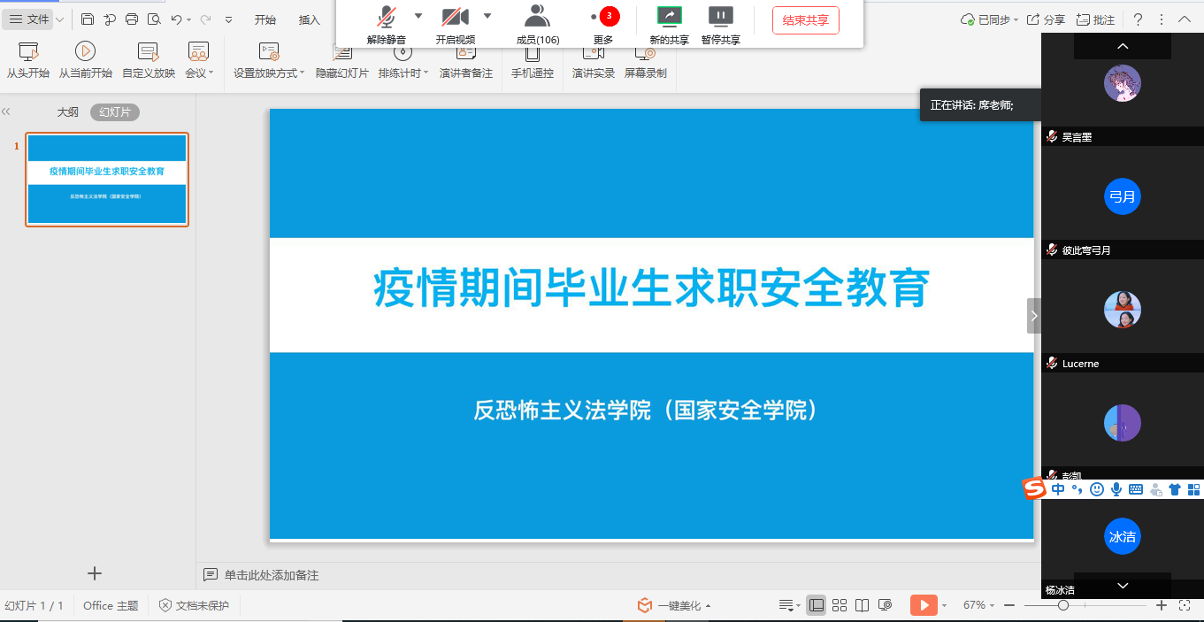 4月23日,反恐怖主义法学院(韩国三级片 )召开2020届毕业生求职安全教育大会,全体本科生通过腾讯会议参加。