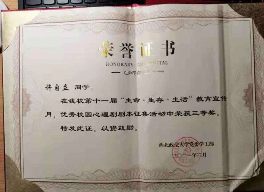 为培养学生积极阳光的乐观心态,全面提高学生心理健康素质,我校学工部组织开展了优秀校园心理剧剧本征集活动,由反恐怖主义法学院许自立、李明月同学为主要负责人所撰写的剧本《捆绑爱情》荣获三等奖。在此次活动中,反恐法学院学生会生活心理部各成员集思广益,以健康的恋爱观为主题,共同撰写修改,最终完成了心理剧本。此剧本内容贴近校园生活,呼应时事热点,体现了学生心灵上的迷途与成长,同时也反映了同学之间、师生之间和谐友爱的深厚情感,有利于培养学生健康心理和良好心态。