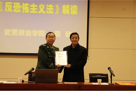 3月23日,我校79级校友、现任武警政治学院教授周健获聘我校客座教授,聘任仪式暨首场学术报告会在图书馆一楼报告厅举行。校长贾宇出席活动并向周健颁发聘任证书。本场报告会的题目为《反恐怖主义法》解读,反恐怖主义法学院全体师生到场参加。
