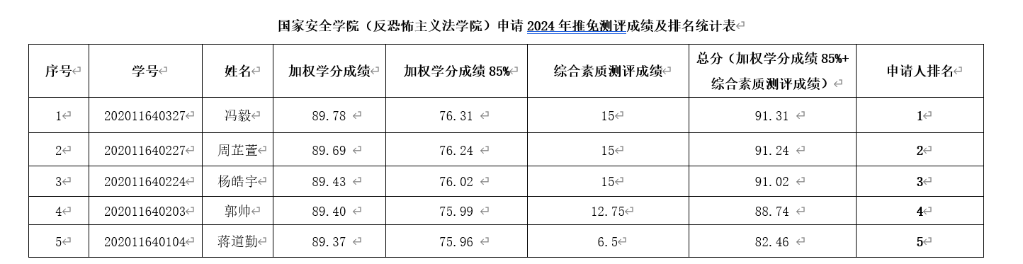根据学校《关于开展2024年推免成绩测评工作的通知》,经过广泛动员宣传,学生自愿申请,学院于2023年9月7日组织公开答辩及评定。经学院推免生遴选工作小组会议审核,现将2024年推免测评成绩及排名进行公示: