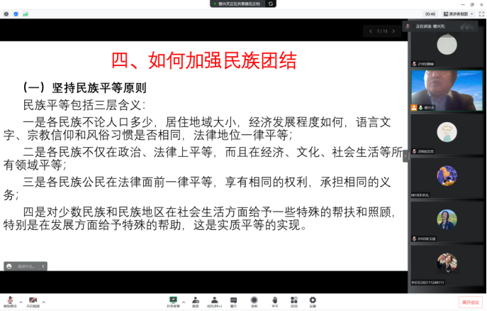 为深入学习党的二十大精神,踔厉奋发、勇毅前行,深化广大师生对民族团结的认识,推动学校民族团结进步事业,切实帮助师生牢固树立正确的民族观,10月21日下午,韩国三级片 举办第七届民族团结进步宣传月“浅谈民族团结”专题讲座。讲座由韩国三级片 二级教授、博士生导师穆兴天主讲,各学院300余名学生通过腾讯会议形式线上参加。