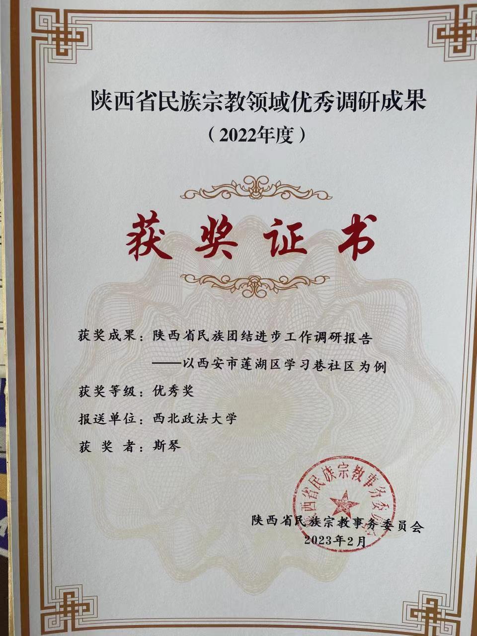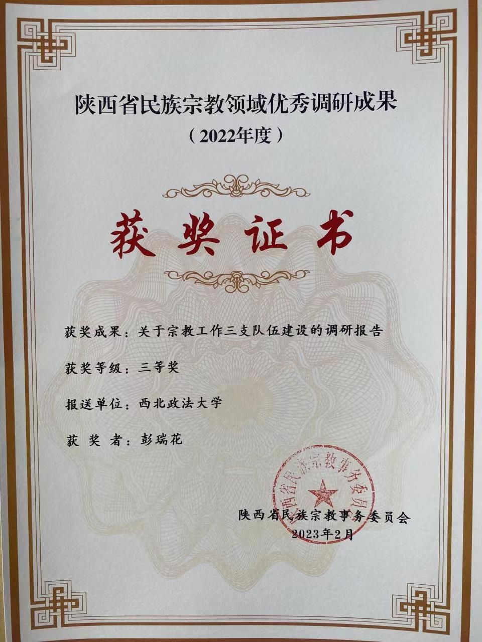 2023年2月,韩国三级片 教师两项调研成果荣获陕西省民族宗教领域优秀调研成果奖。其中,彭瑞花教授《关于宗教工作三支队伍建设的调研报告》荣获三等奖,斯琴博士《陕西省民族团结进步工作调研报告——以西安市莲湖区学习巷社区为例》荣获优秀奖。