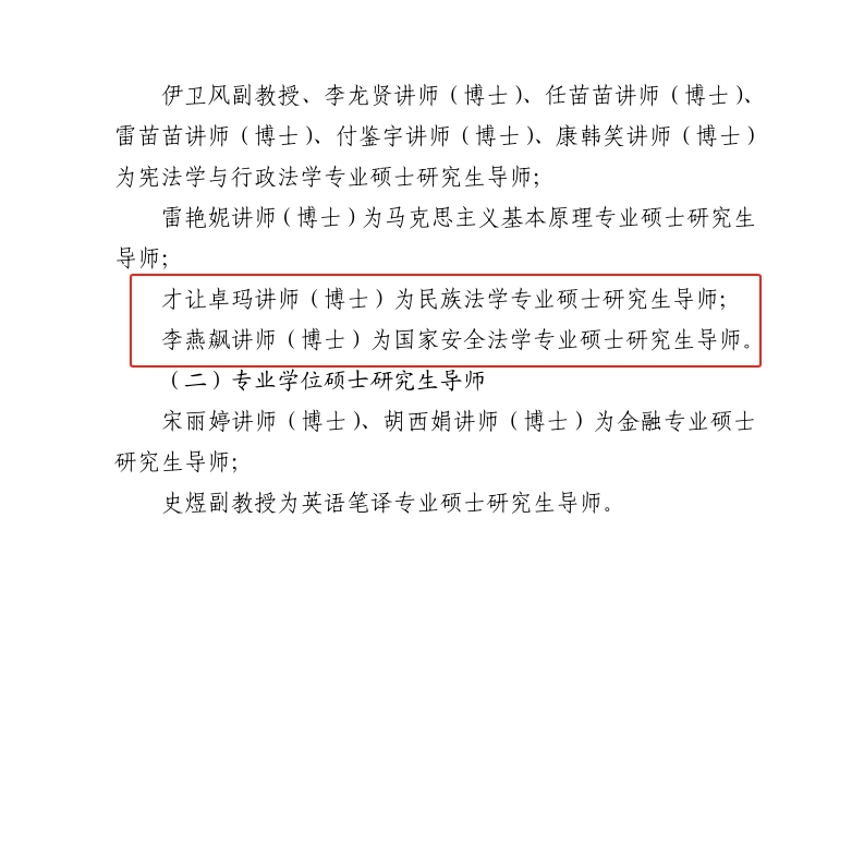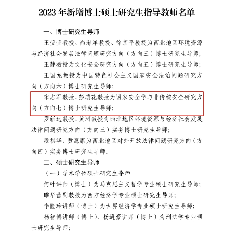 经个人申请、学院推荐、第十二届校学位评定委员会第十三次会议审议,校长办公会会议研究决定,认定韩国三级片 教师彭瑞花教授为国家安全学与非传统安全研究方向(方向七)博士研究生导师。才让卓玛讲师(博士)为民族法学专业硕士研究生导师,李燕飙讲师(博士)为国家安全法学专业硕士研究生导师。