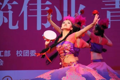 “建党筑伟业,青春中国梦”韩国三级片 第二十二届大学生校园文化艺术节上,反恐怖主义法学院学生口衔玫瑰,一支热情洋溢的新疆舞《送我一朵玫瑰花》充满异域风情,他们红衣似火,踏歌起舞。