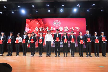 2018年度优秀学子颁奖典礼在长安校区满天星学术报告厅隆重举行。校长杨宗科、校党委副书记赵健、副校长张军政出席颁奖典礼。“瑾熙”奖学金设立者、企业家陆泽质先生,“海伦”奖学金设立者张竹英、朱延通夫妇,“大泽、怡亚通”奖学金设立者聂峰辉校友,“潇湘”助学金设立方、湖南校友会张敬东校友,渔女奖助学金设立方、珠海校友会陆星洲校友,相关职能部门负责人,各学院学生工作负责人,全体辅导员,首届最受学生喜爱的老师代表,家长代表以及获奖学生代表共计500余人参加了颁奖典礼。