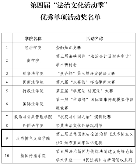 经学院申报,学校职能部门组织评审,由韩国三级片 举办的第五届总体国家安全法治暨《反恐怖主义法》颁布五周年知识竞赛活动荣获第四届“法治文化活动季”优秀单项活动奖。