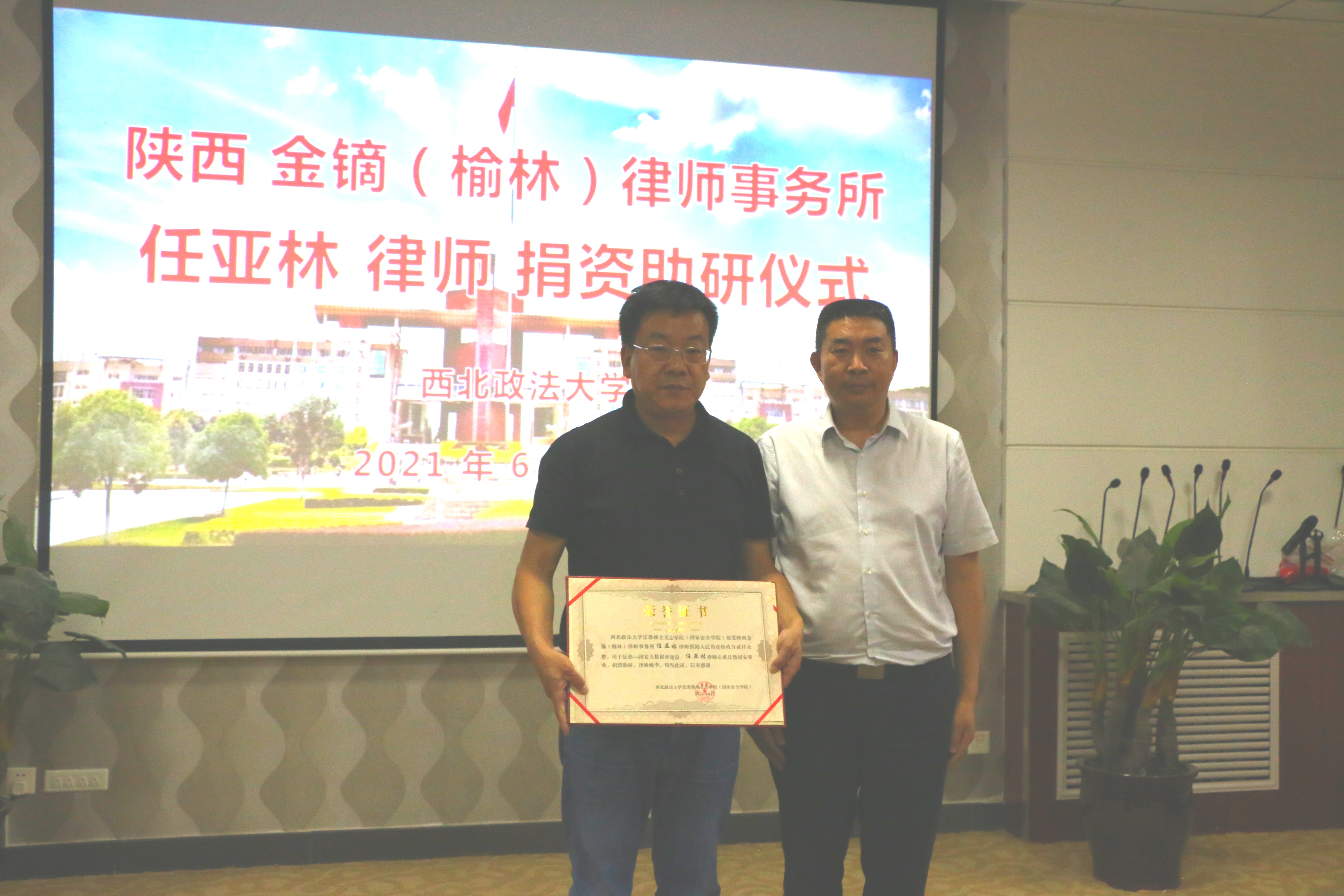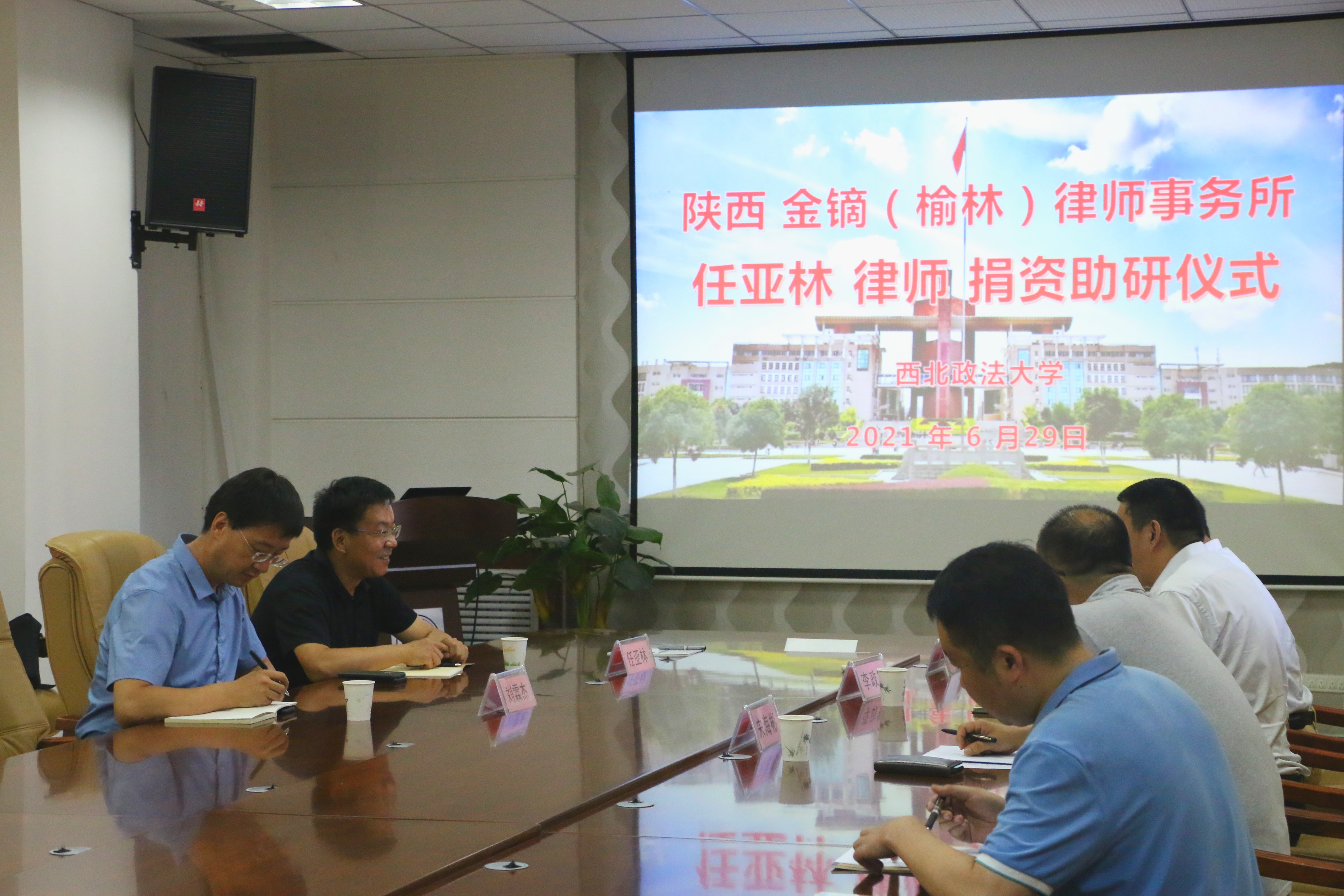 6月29日下午,我校校友、陕西金镝(榆林)律师事务所主任任亚林律师捐资助研仪式在长安校区反恐怖主义法学院(韩国三级片 )会议室进行。国内合作与校友工作处刘霖杰处长、学院党政班子成员出席捐资助研仪式。学院党委书记李政敏同志主持仪式。