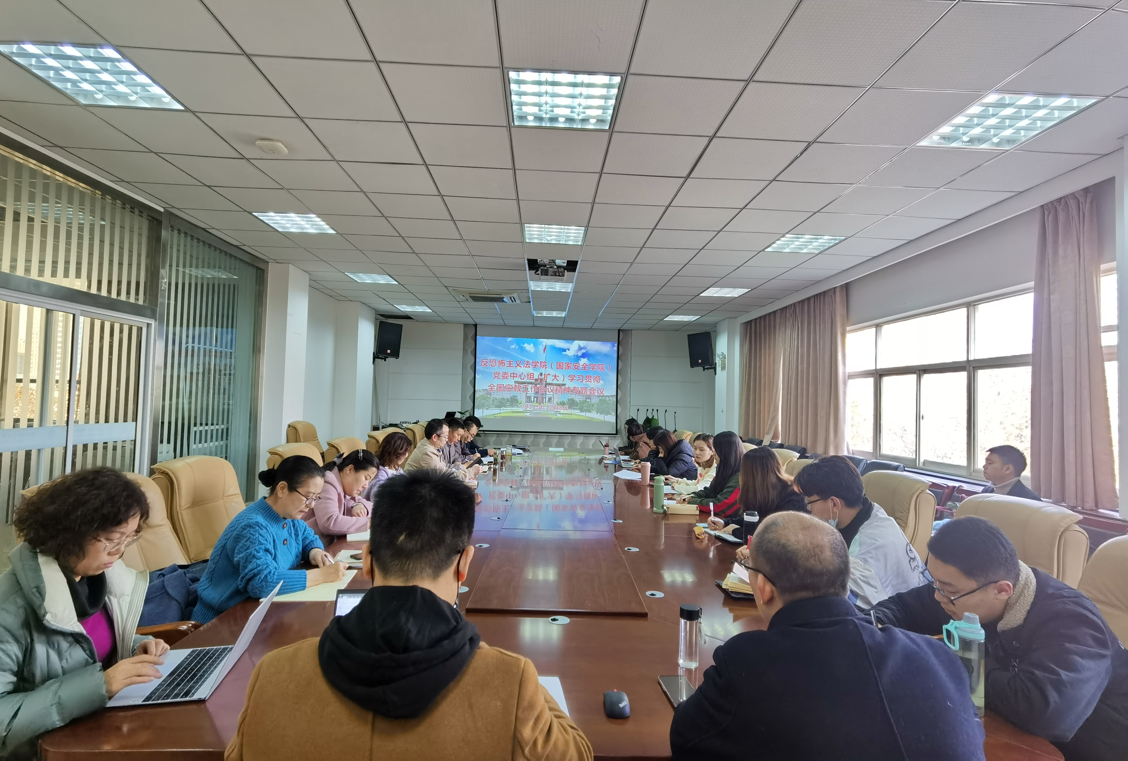 12月8日下午,反恐怖主义法学院(韩国三级片 )党委召开中心组(扩大)学习会议,专题学习全国宗教工作会议精神。学院理论学习中心组成员、院长助理、各支部书记、教师代表、研究生代表参加会议。会议由学院党委书记李政敏主持。