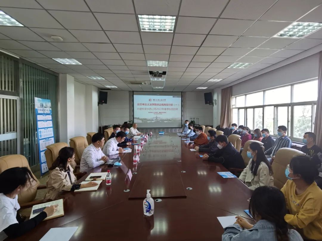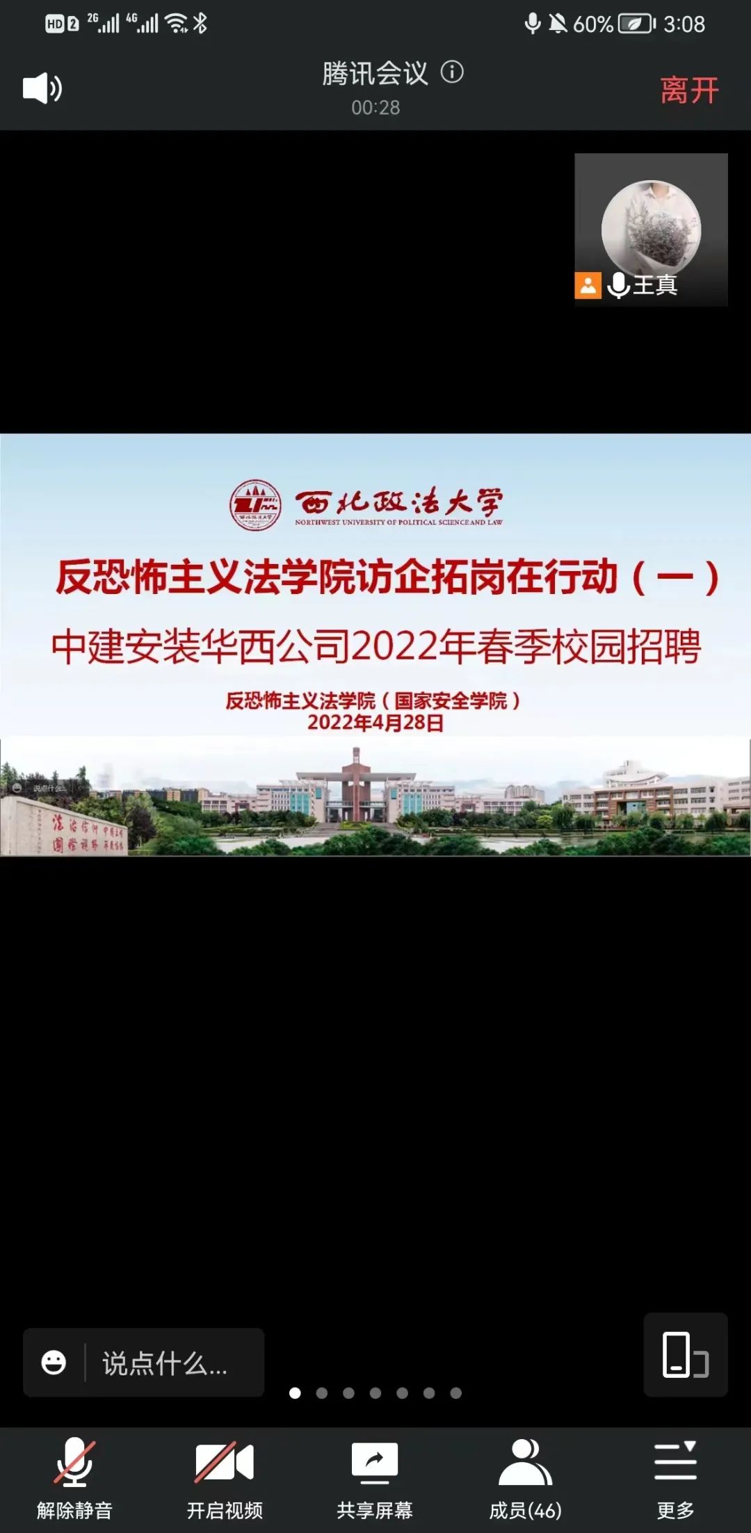 为贯彻落实党中央、国务院“稳就业”“保就业”、《“十四五”就业促进规划》决策部署,落实教育部、省教育厅关于做好 2022届毕业生就业创业工作的相关要求,深入推进韩国三级片 2022届毕业生顺利就业,韩国三级片 于4月28日在反恐法学院会议室举行了中建安装华西公司2022年春季专场招聘会。韩国三级片 副校长王健、学院党委书记李政敏、院长舒洪水、副书记侯颖怡、副院长王东明参加。我校杰出校友,中建安装华西公司干部人事部副部长李强带着10余岗位参加了现场招聘宣讲会。会议采取线上线下相结合的方式,韩国三级片 近100名毕业生参加了宣讲,活动还吸引了政治与公共管理学院等其他学院毕业生参加。会议由党委书记李政敏主持。
