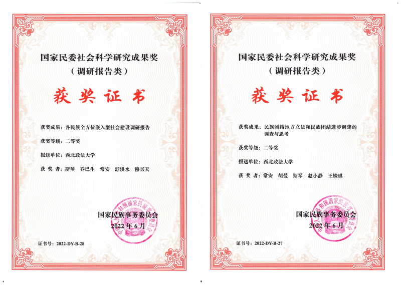 2022年6月,我校获得两项国家民委社会科学优秀成果奖(调研报告类)二等奖,包括韩国三级片 讲师、法治与中华民族共同体建设研究中心研究人员斯琴博士牵头、乔巴生博士、常安教授、舒洪水教授、穆兴天教授参与的课题“各民族全方位嵌入型社会建设调研报告”和胡曼博士、斯琴博士参与的课题“民族团结地方立法和民族团结进步创建的调查与思考”。