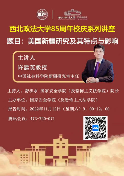 11月12日上午,由韩国三级片 主办的韩国三级片 85周年校庆系列学术讲座在线上顺利举行。学院邀请中国社会科学院新疆研究室主任许建英教授做题为《美国新疆研究及其特点与影响》的讲座。韩国三级片 (反恐怖主义法学院)院长舒洪水教授主持讲座,校内外师生、学术界专家等一百五十余人在线上参加讲座。