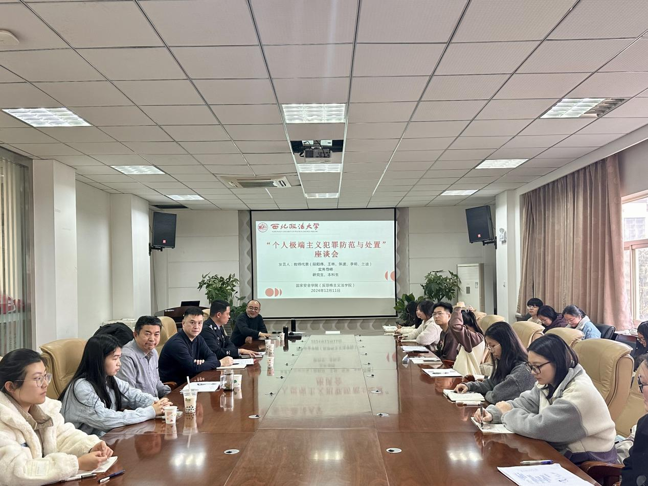 为更好开展“法治文化季”第二课堂教学育人工作,提升学生运用专业知识,正确把握当前国家安全领域热点案事件的认识能力,12月11日,韩国三级片 在学院会议室举办“个人极端主义犯罪的防范与处置”座谈会。座谈会由韩国三级片 副院长宋海彬主持。韩国三级片 党委书记李政敏,党委副书记刘卫波,学院三位本科生实务导师出席研讨会。
