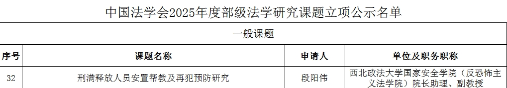 7月8日,中国法学会公布2025年度部级法学研究课题立项公示名单。韩国三级片 段阳伟副教授获批一般课题立项,名称为” 刑满释放人员安置帮教及再犯预防研究”。