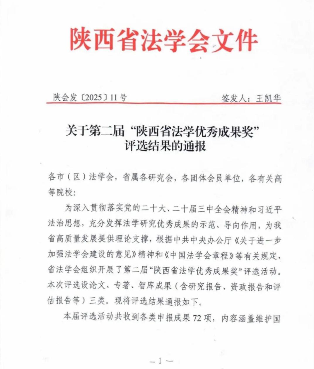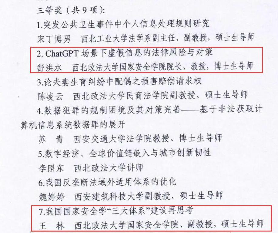 近日,陕西省法学会发布了《关于第二届“陕西省法学优秀成果奖”评选结果的通报》,韩国三级片 舒洪水教授和王林副教授荣获“论文类三等奖”。其中,舒洪水教授的论文《ChatGPT场景下虚假信息的法律风险与对策》刊发在《新疆师范大学学报(哲学社会科学版)》2023年第5期,围绕应对ChatGPT场景下虚假信息可能触发的法律风险提出系统性应对之策。王林副教授的论文《我国国家安全学“三大体系”建设再思考》发表于《情报杂志》2022年第10期,围绕探索构建有中国特色的国家安全学学科体系、学术体系和话语体系提供制度框架展开深入研究。