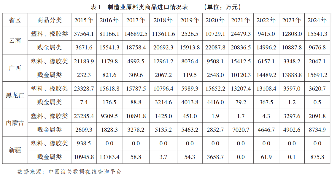 具体来看,塑料、橡胶类产品为制造业原料进口中规模最大类别,累计进口71.40亿元,占比53.4%,呈“先扬后抑”和剧烈波动趋势,2015年达10.67亿元高点,2024年降至2.34亿元,其中,以云南为主要进口省区,累计占比4.57%,2018年达峰值12.75%,2019年骤降至0.34%,此后未恢复;广西累计8.49亿元,占3.14%,2021年达峰值6.53%,2024年降至2.51%;黑龙江进口逐年下降,2024年接近零;辽宁、吉林、西藏累计进口不足0.2亿元,规模极小(见表1)。