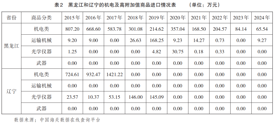 区域分布上,机电及高附加值商品进口呈东北“双核心”主导格局,黑龙江和辽宁10年累计进口额分别为3738.96万元和3456.48万元,合计占比达82.84%。尽管黑龙江总量居首,但进口额从2015年的807万元降至2024年的65.65万元,降幅逾九成;辽宁则在2017年达1421.22万元峰值后,自2018年起连续7年为0,反映该类商品进口在东北地区呈现明显衰退(见表2)。