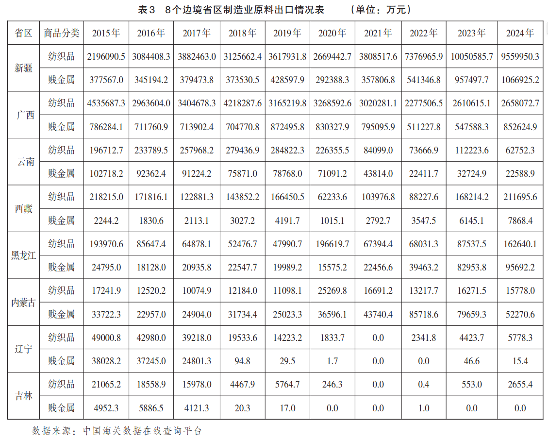 在出口数据中,纺织品出口额最高,8个边境省区累计达8619.01亿元,占71.9%,贱金属及其制品出口额1402.89亿元,占11.7%,塑料、橡胶类商品出口额1001.97亿元,占比8.4%,建筑材料及陶瓷、玻璃制品等轻工原料出口额955.59亿元,占比0.8%。其中,新疆和广西作为制造业原料类商品出口的核心省区,累计出口额分别为6078.59亿元和5102.72亿元,呈现出显著集聚效应。其他如云南、黑龙江、西藏、内蒙古、辽宁、吉林等省区出口额均未超过300亿元,呈梯次分布。